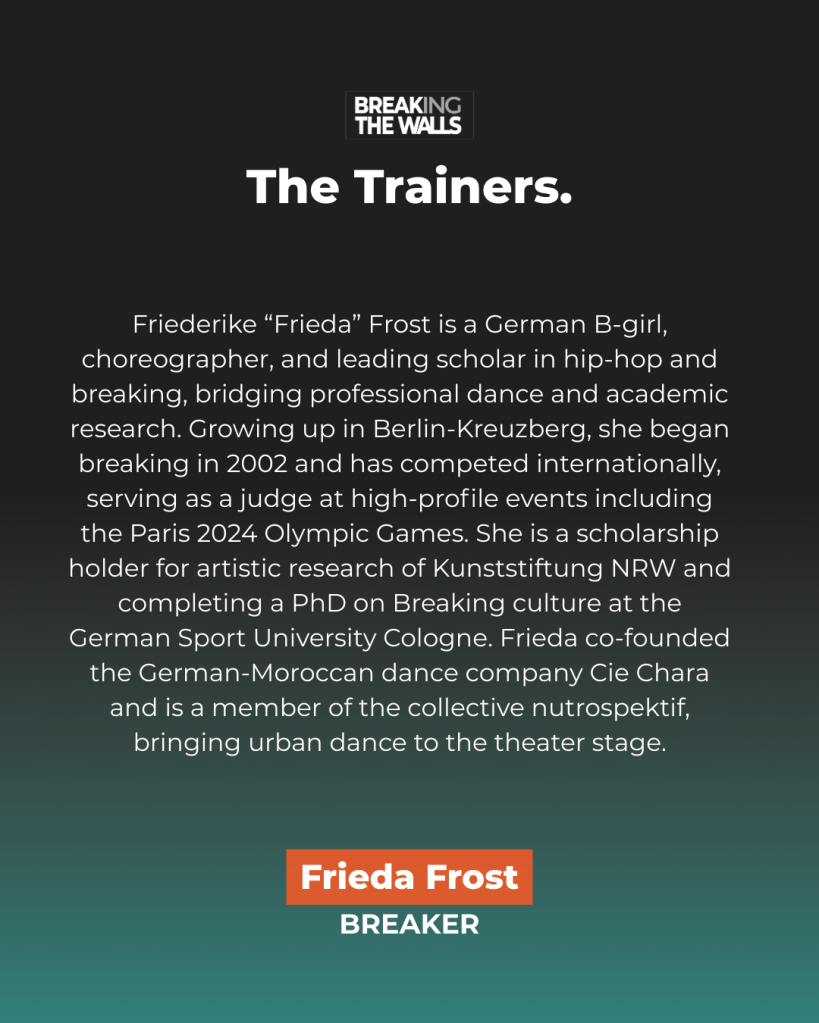 Friederike “Frieda” Frost is a German B-girl, choreographer, and leading scholar in hip-hop and breaking, bridging professional dance and academic research. Growing up in Berlin-Kreuzberg, she began breaking in 2002 and has competed internationally, serving as a judge at high-profile events including the Paris 2024 Olympic Games. She is a scholarship holder for artistic research of Kunststiftung NRW and completing a PhD on Breaking culture at the German Sport University Cologne. Frieda co-founded the German-Moroccan dance company Cie Chara and is a member of the collective nutrospektif, bringing urban dance to the theater stage.